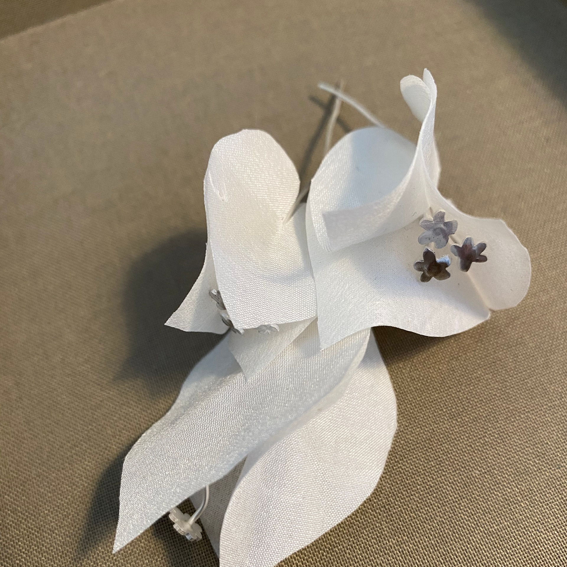 Garnbollar som örhängen, en tussilagolotusring av silkegarn och silver. Bougainville-blommor av handgjort bokklot av japanpapper och pongésiden.